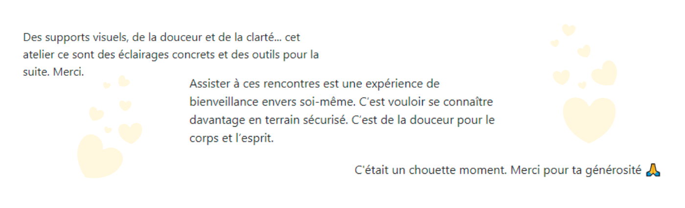 Une belle harmonie : sourire, non-jugement et bienveillance sont des valeurs essentielles au bon fonctionnement de notre groupe, je suis ravie de vous accueillir dans cet esprit 💗